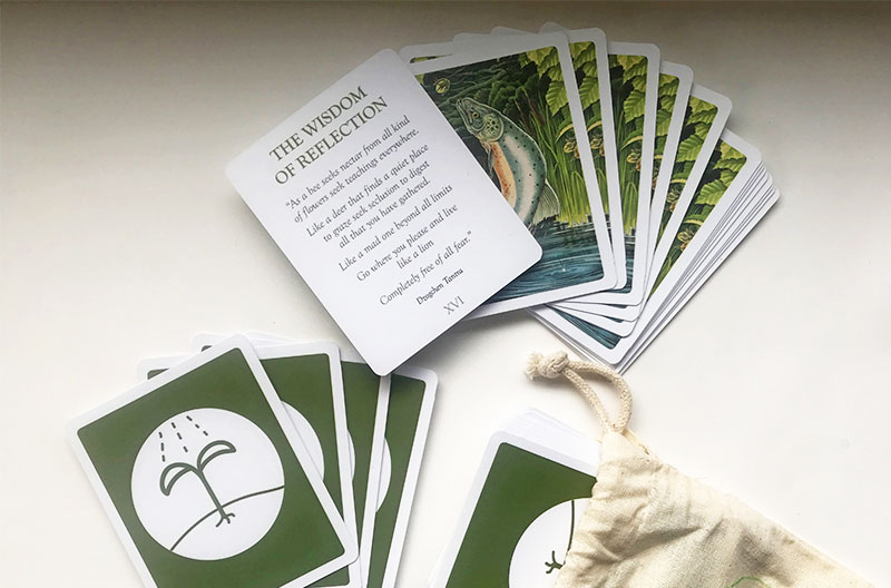 As a companion to the book I have produced a set of  Living Treefully cards – 36 ‘Way-Showing’ cards and 16 ‘Wisdom’ cards. These cards can be used for finding an answer to a personal question you have when taking a walk in a forest or a labyrinth. These cards came out of a workshop with a number of colleagues who were working around the Wheel of Segais testing the ‘Living Treefully’ metaphor for me. I have a beautiful, large labyrinth on my farm and I thought walking it could also help test the metaphor. So we took a few questions and wisdom statements from the book and out to the labyrinth we went. It was a great success. Participants kept saying things like, “How did it know?” or “The answer was so right for me but I would never have thought of it!” and so on.  The book benefited and the Cards were born. Happy Wheel!
